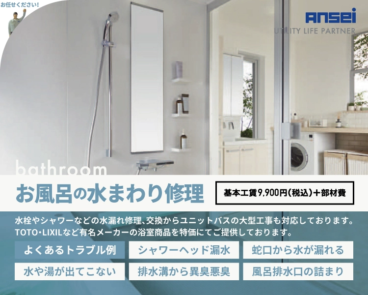 一人でゆっくりホッとするお風呂。キャッキャキャッキャと楽しそうな声がする、家族のお風呂。お風呂には物語があり、思い出があり、良い時間と空間があります。幸せな時間を過ごすためにもトラブルは避けたいものですが、毎日使うからこそ、そうも行きません。一刻も早く解決するためにアンセイは緊急で駆けつけます!トラブルの原因がわからない場合でもご相談ください。現場を調査し、ご説明と無料お見積もりを提出いたします。
