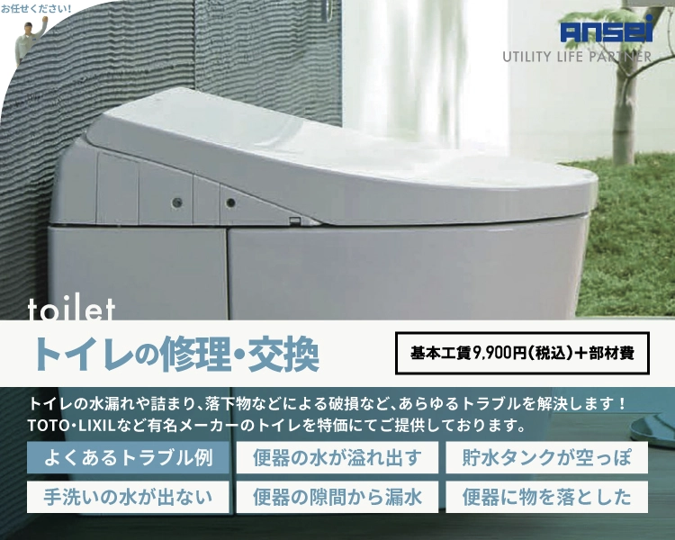 毎日みんなが使うから、トイレを綺麗にしたい、綺麗に使いたい。そんな想いから快適な空間づくりや、香りに気遣い、こまめなお掃除をする。とても素敵なことですね。ただ、どんなに大切に扱っているトイレでも急なトラブルだけは避けることができません!一刻も早く解決するためにアンセイは緊急で駆けつけます!トラブルの原因がわからない場合でもご相談ください。現場を調査し、ご説明と無料お見積もりを提出いたします。